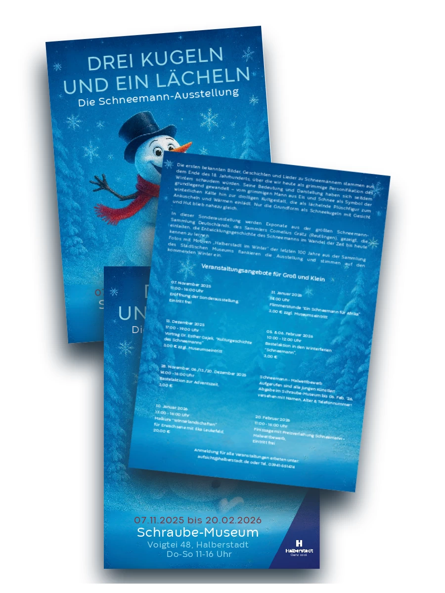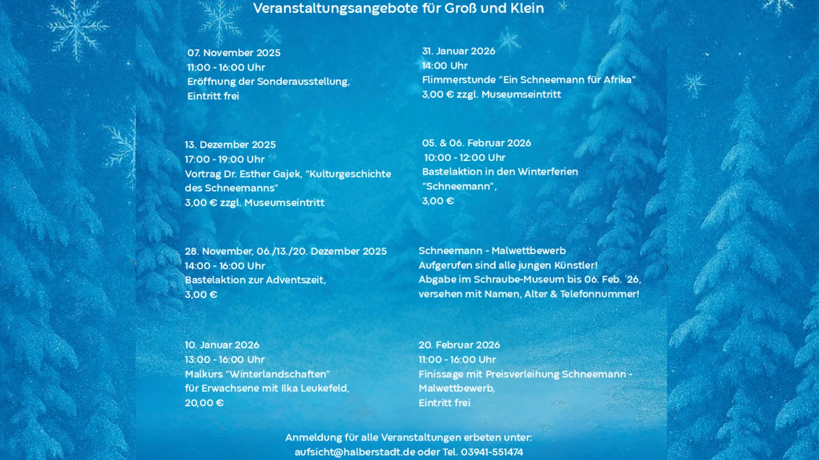Auf der Nordseite des Harzes befindet sich das Städtchen Halberstadt, das sich selbst ‚Tor zum Harz‘ nennt. Im Winter 2025/2026 ist die Schneemannausstellung hier zu Gast. In der Harz Region, dem nördlichsten Mittelgebirge in Deutschland, kennt man schneeeiche Winter. Ausgestellt werden die Schneemänner im Schraube-Museum, benannt nach der Fabrikantenfamilie Schraube.